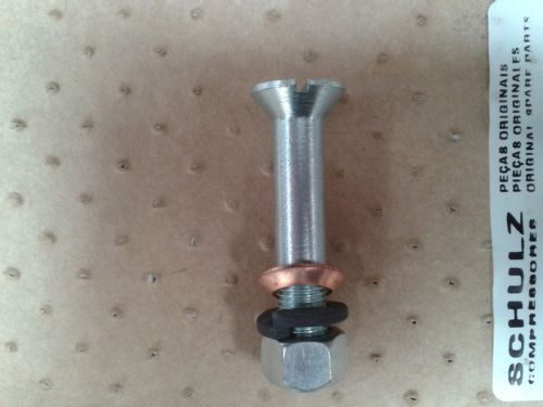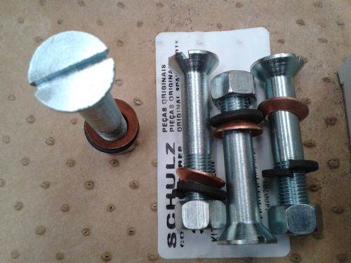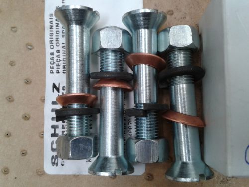 Conjunto fabricado pela Schulz, Conjunto de 4 parafusos, 4 porcas, 4 arruela de pressão e 4 arruela de cobre, Medidas: Parafuso diâmetro 3/8" = 9.50 mm x 55 mm altura total, cabeça cônica. Consultar preço para venda somente de um parafuso. – *Pague em 2 vezes s/acréscimo no cartão de credito ou até 12 vezes c/acréscimo 2,99% ao mês - *Desconto p/pagamento à vista, diretamente ao PagSeguro através de depósito em conta corrente, boleto, débito online – (*Verificar valores mínimos p/parcelar e ou à vista no carrinho de compras)-(*Obs. Você precisa estar Logado ao site PagSeguro para ver simulação e valor do frete) – Desc. 6% p/deposito na conta corrente da Ortiz Peças e Equip. Ind. Ltda. - FAÇA QUANTAS PERGUNTAS FOR NECESSÁRIO PARA TIRAR AS DÚVIDAS ANTES DE COMPRAR – Responderemos as perguntas dentro do horário de funcionamento, 2ª a 6ª feira, das 8:00 às 17:30 - QUANTIDADE EM ESTOQUE:02